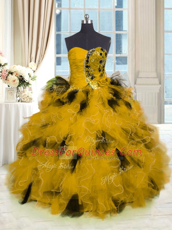 Gold Quince Ball Gowns Military Ball and Sweet 16 and Quinceanera and For with Beading and Ruffles Strapless Sleeveless Lace Up