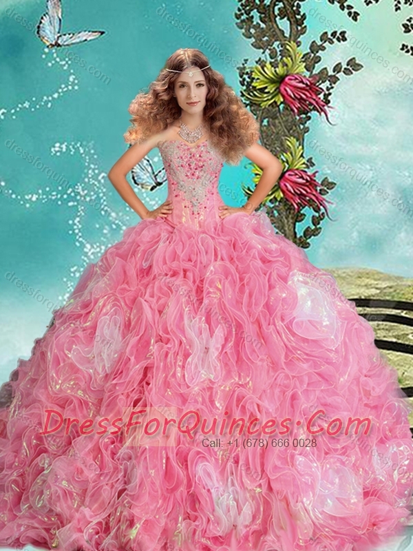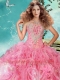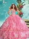 Gorgeous Rose Pink Brush Train Quinceanera Dress in Rolling Flowers