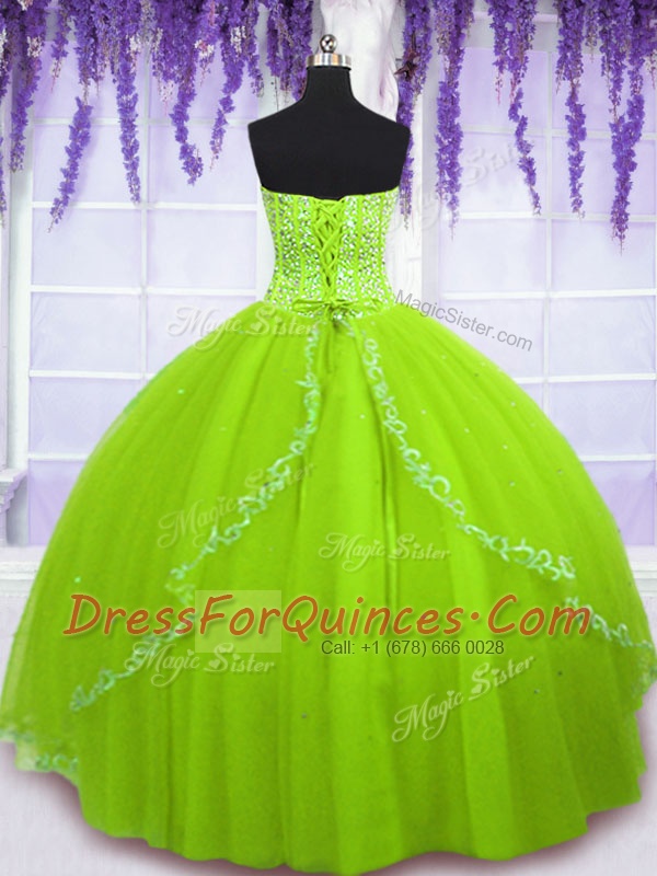 Great Sleeveless Floor Length Beading Lace Up Sweet 16 Dresses with Yellow Green