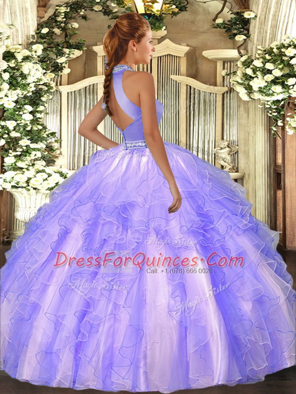 Halter Top Sleeveless Quinceanera Dresses Floor Length Beading and Ruffles Baby Blue Organza