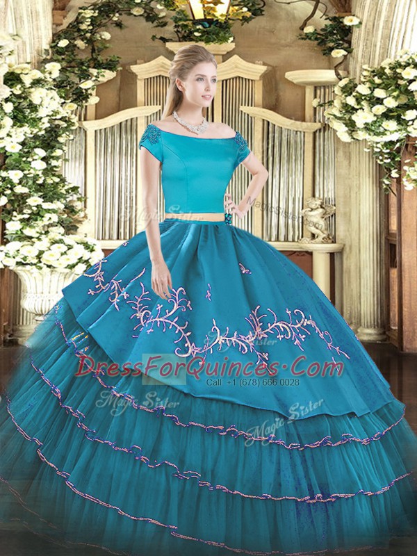 High End Teal Off The Shoulder Neckline Embroidery and Ruffled Layers 15 Quinceanera Dress Short Sleeves Zipper