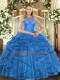 Ideal Sleeveless Organza Floor Length Lace Up Quince Ball Gowns in Teal with Beading and Ruffles
