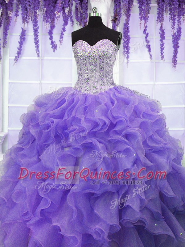 Lavender Ball Gowns Sweetheart Sleeveless Organza Floor Length Lace Up Ruffles and Sequins Vestidos de Quinceanera