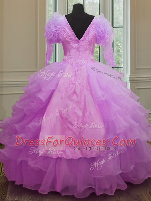Long Sleeves Organza Floor Length Zipper Ball Gown Prom Dress in Lilac with Ruffled Layers
