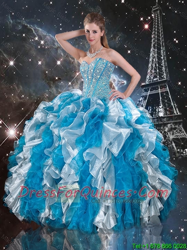 Luxurious Beaded White and Blue Sweet 16 Gowns with Ruffles