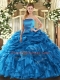Modest Sleeveless Floor Length Ruffles and Pick Ups Lace Up Sweet 16 Quinceanera Dress with Blue
