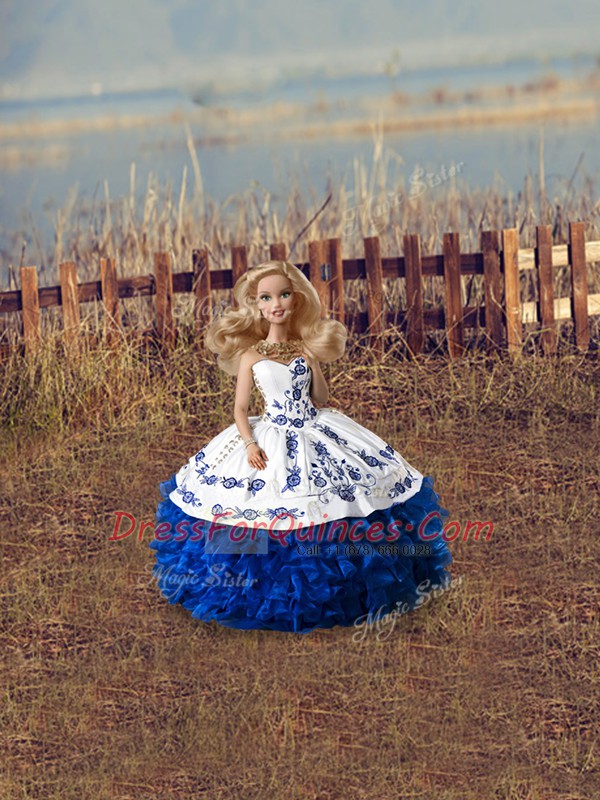 Noble Sweetheart Sleeveless Quinceanera Dresses Floor Length Embroidery and Ruffles Blue And White Organza