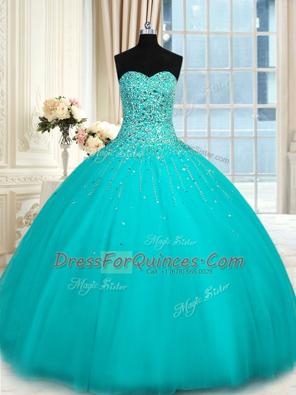Noble Tulle Sweetheart Sleeveless Lace Up Beading Quinceanera Gown in Turquoise