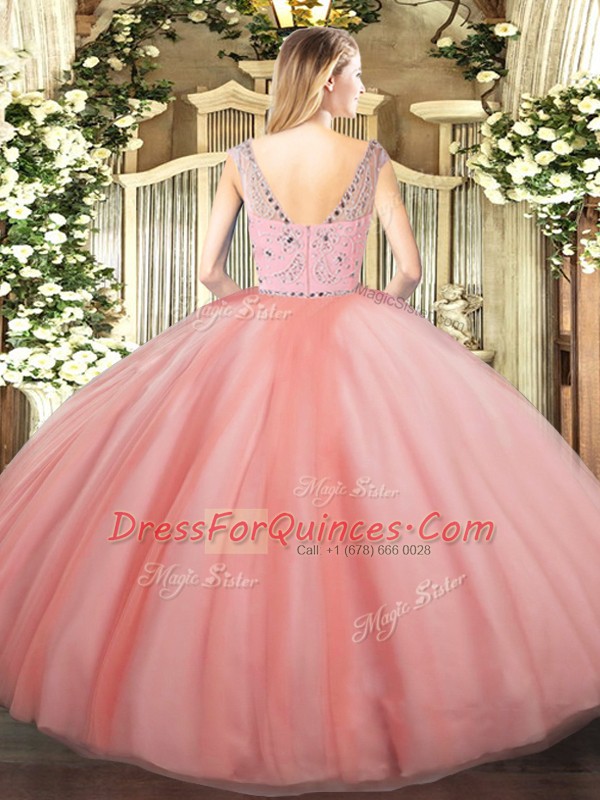 Peach Tulle Zipper Quinceanera Dress Sleeveless Floor Length Beading