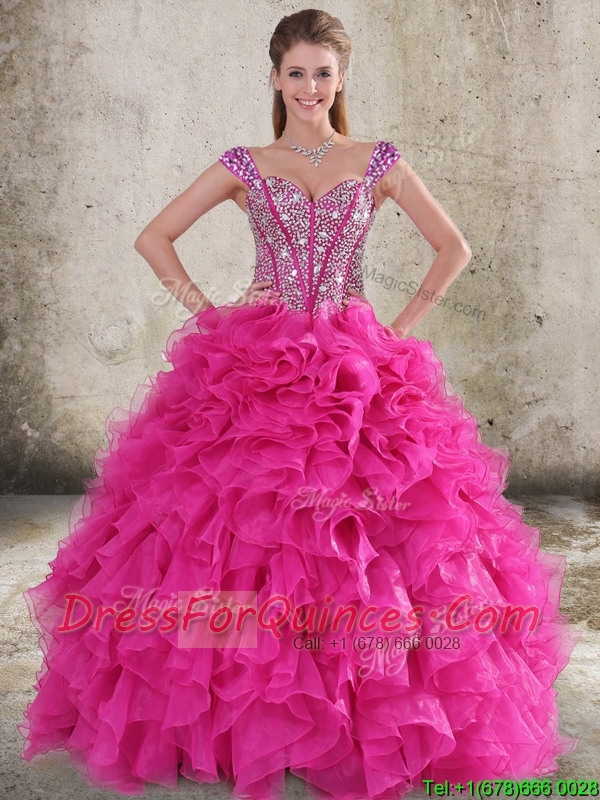 Perfect Ruffled and Beaded Bodice Straps Hot Pink Sweet 16 Quinceanera Dress