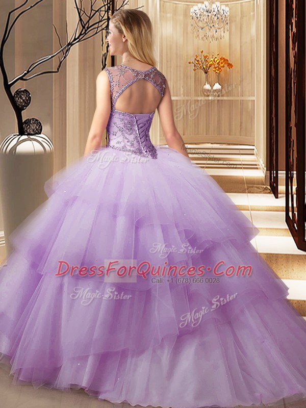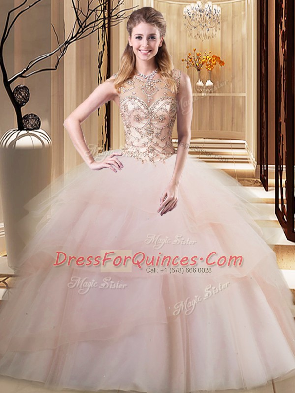 Popular Scoop Sleeveless Beading and Ruffled Layers Lace Up 15th Birthday Dress with Peach Brush Train