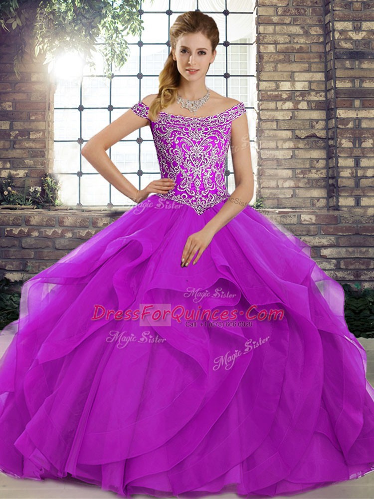 Purple Lace Up Off The Shoulder Beading and Ruffles Quinceanera Gowns Tulle Sleeveless Brush Train