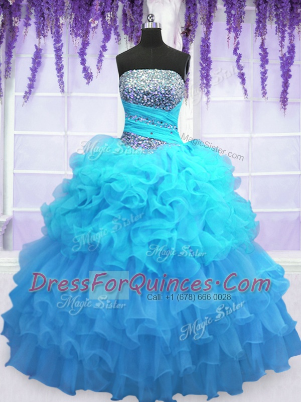 Sleeveless Floor Length Beading and Ruffled Layers and Pick Ups Lace Up Sweet 16 Dress with Aqua Blue