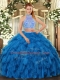 Sleeveless Floor Length Beading and Ruffles Criss Cross Vestidos de Quinceanera with Blue