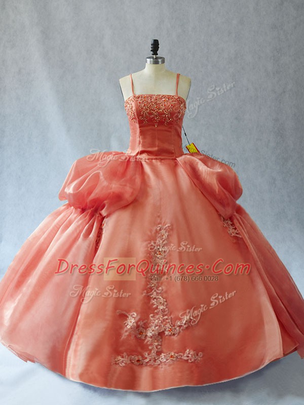 Sleeveless Organza Floor Length Lace Up Sweet 16 Dresses in Rust Red with Appliques
