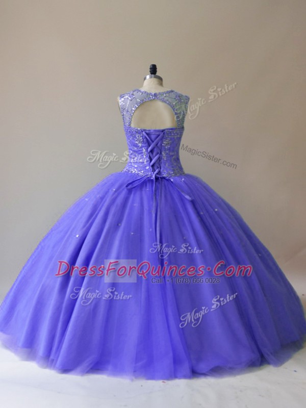Sleeveless Tulle Floor Length Lace Up Sweet 16 Quinceanera Dress in Purple with Beading
