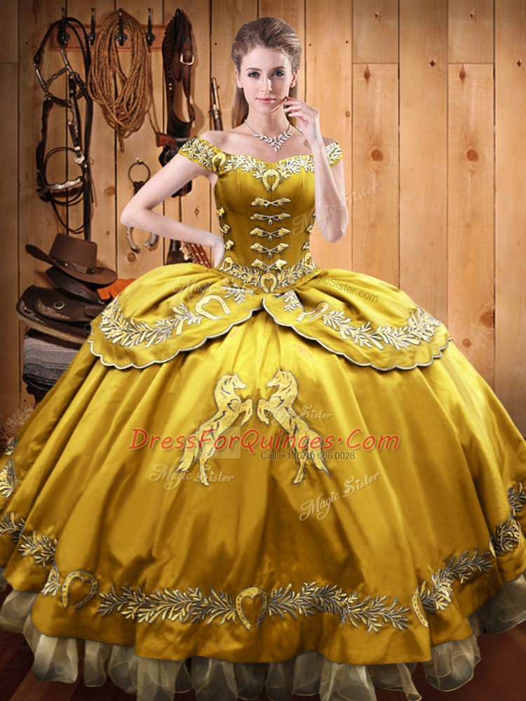 Sweet Gold Ball Gowns Satin and Organza Off The Shoulder Sleeveless Beading and Embroidery Floor Length Lace Up Ball Gown Prom Dress
