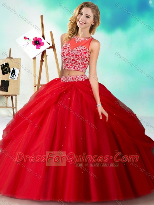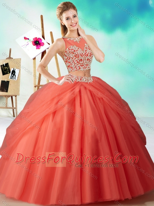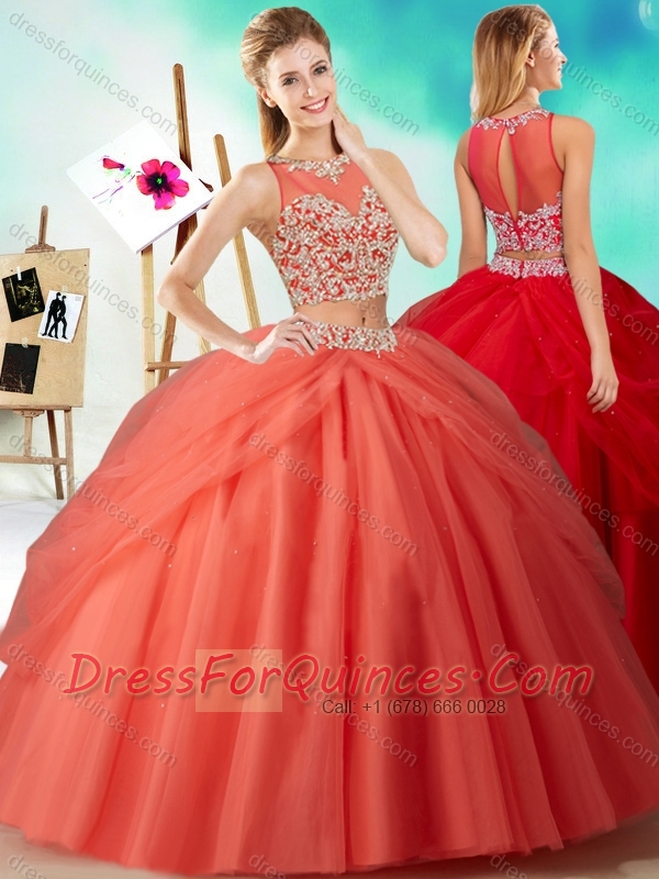 Two Piece See Through Beaded Quinceanera Dress in Orange Red