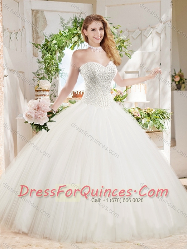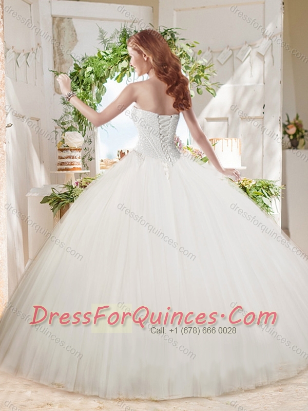 White Ball Gown Sweetheart Court Train Beaded Quinceanera Dress in Tulle