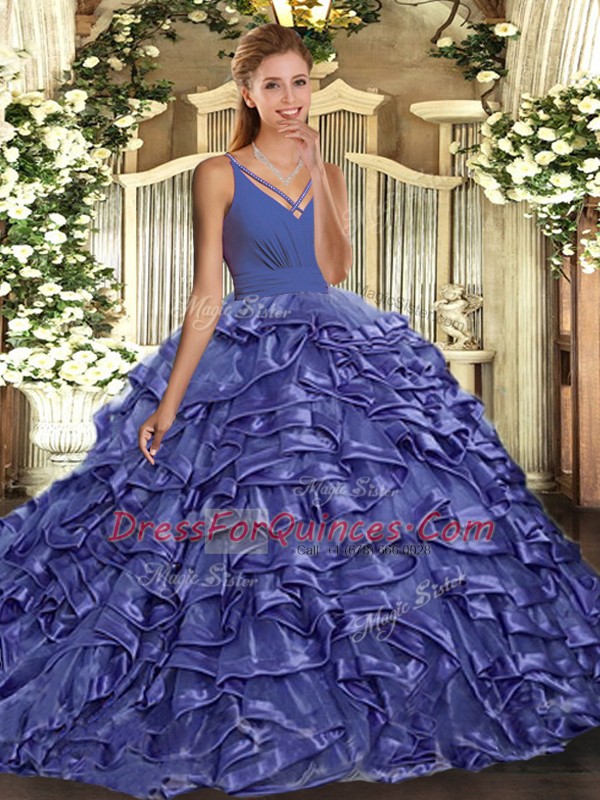 With Train Lavender Sweet 16 Dress V-neck Sleeveless Sweep Train Backless