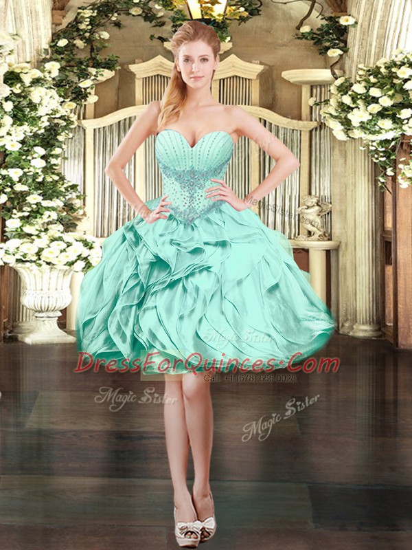 Affordable Sleeveless Mini Length Beading and Ruffles Lace Up Party Dress for Toddlers with Apple Green