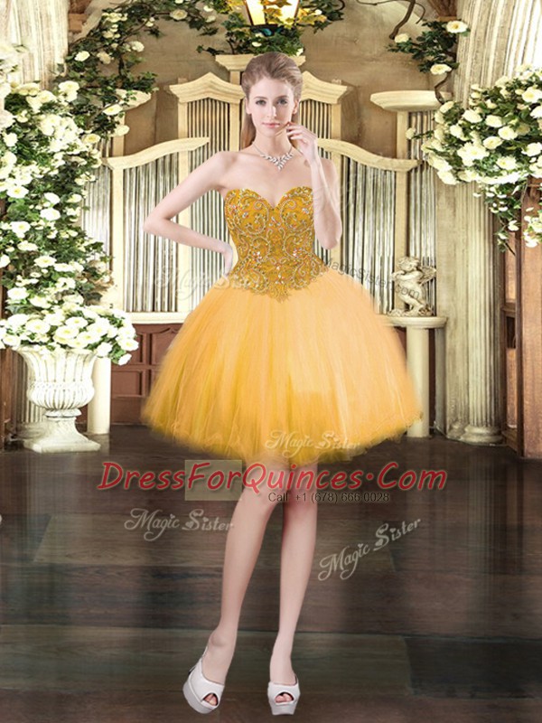 Ball Gowns Womens Party Dresses Gold Sweetheart Tulle Sleeveless Mini Length Lace Up