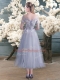 Best Selling A-line Teens Party Dress Grey Off The Shoulder Tulle Short Sleeves Ankle Length Lace Up