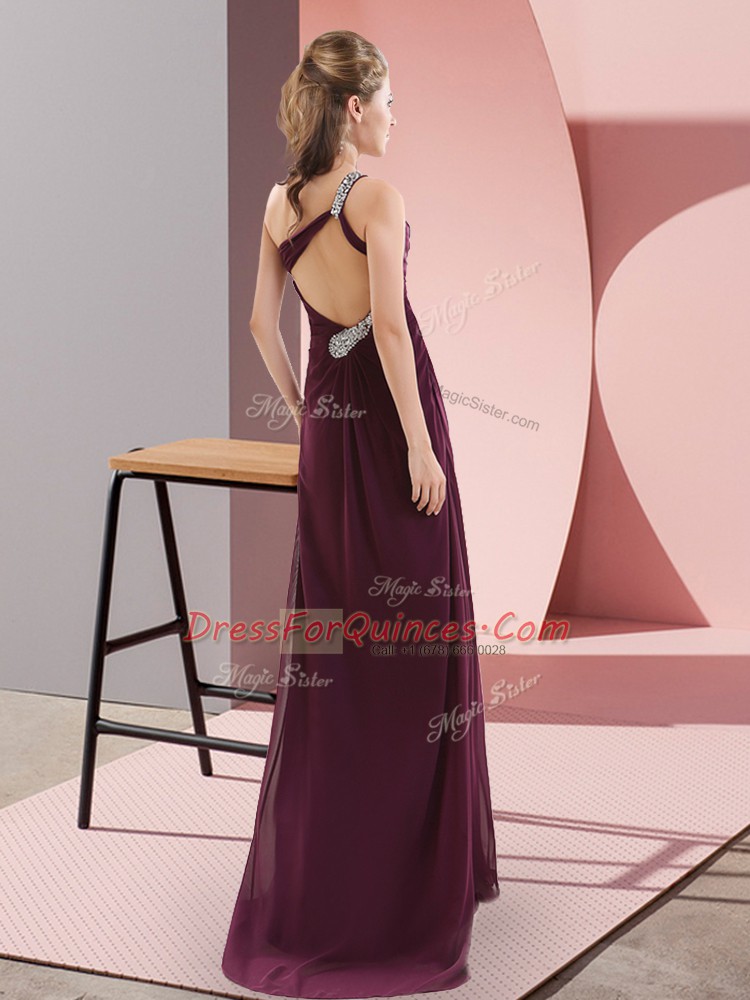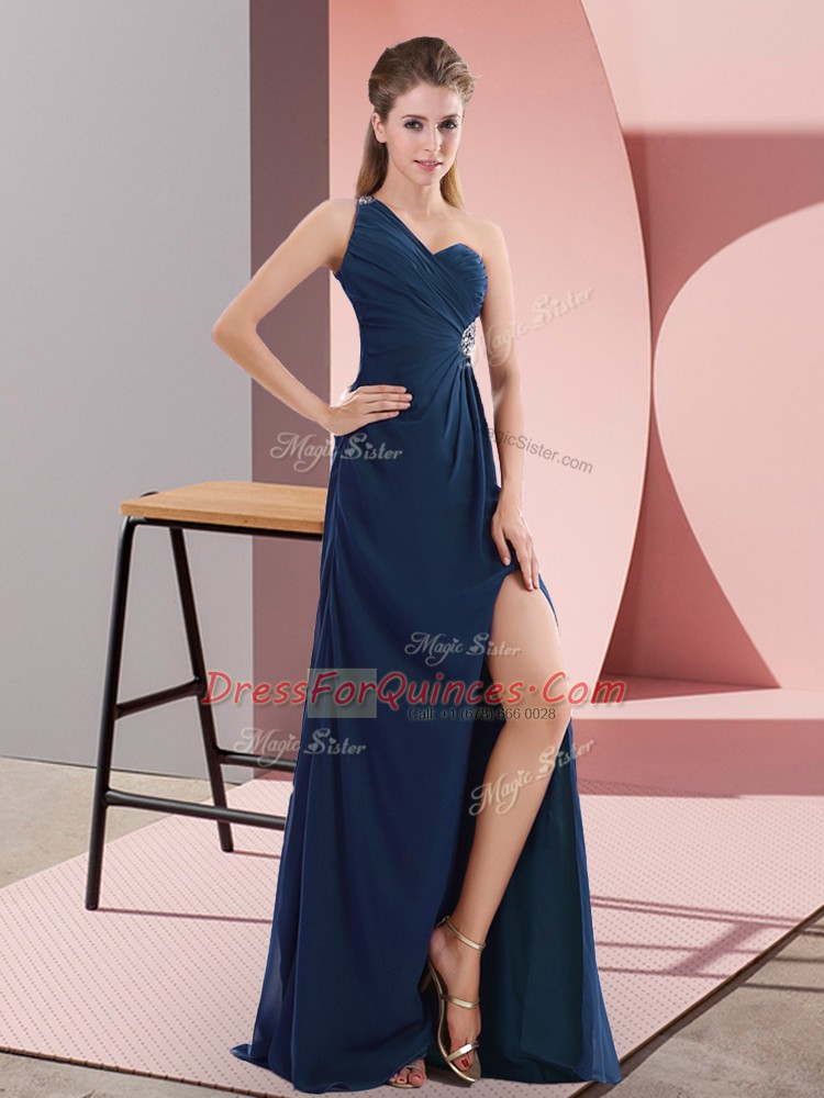 Classical Beading and Ruching Custom Made Navy Blue Backless Sleeveless Sweep Train