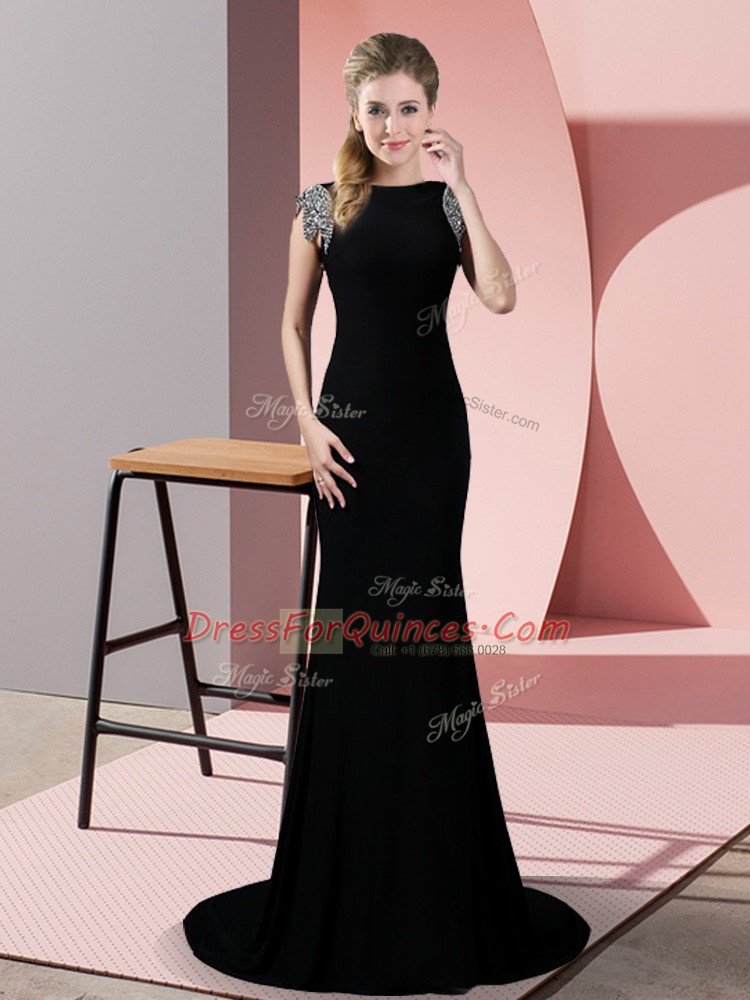 Clearance Short Sleeves Beading Backless Party Dress with Black Brush Train