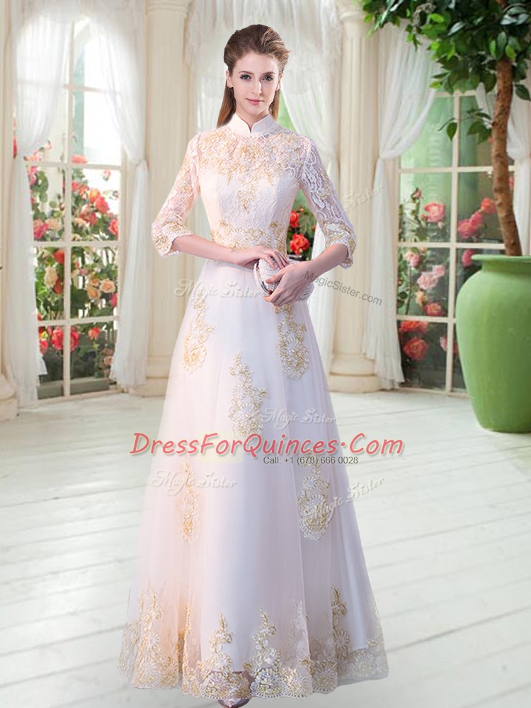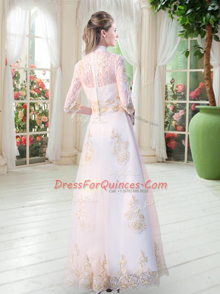 Clearance White A-line Appliques Teens Party Dress Zipper Tulle 3 4 Length Sleeve Floor Length
