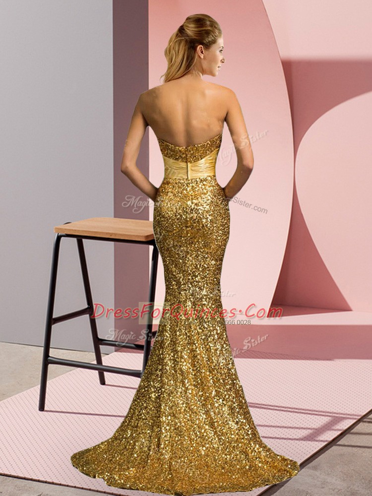 Customized Sweetheart Sleeveless Sweep Train Backless Party Dress for Girls Pink Sequined
