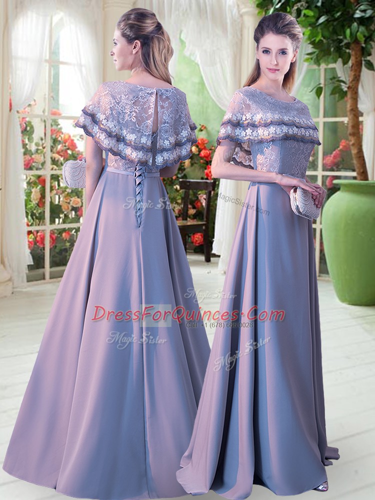 Grey A-line Scoop Short Sleeves Satin Floor Length Lace Up Lace Custom Made