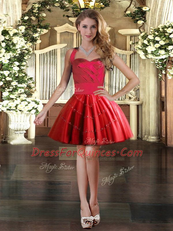 High Class Tulle Halter Top Sleeveless Lace Up Appliques Party Dress Wholesale in Red
