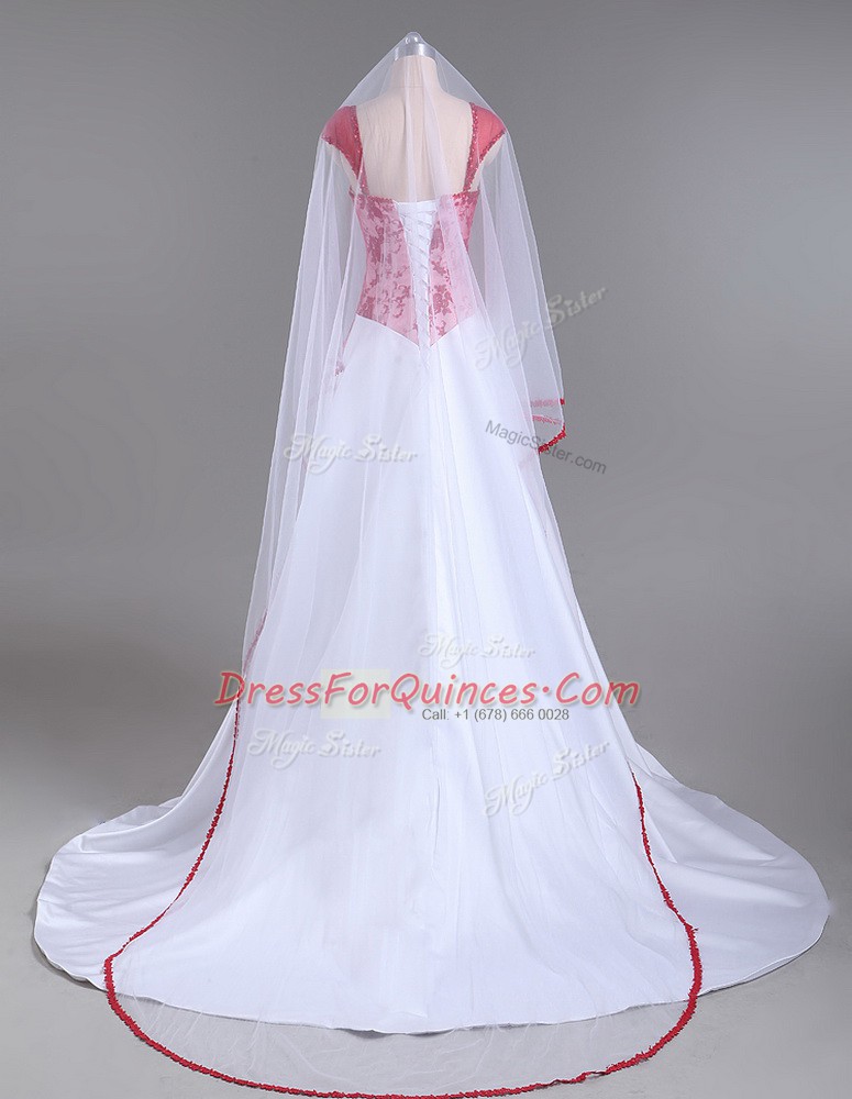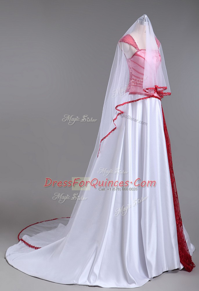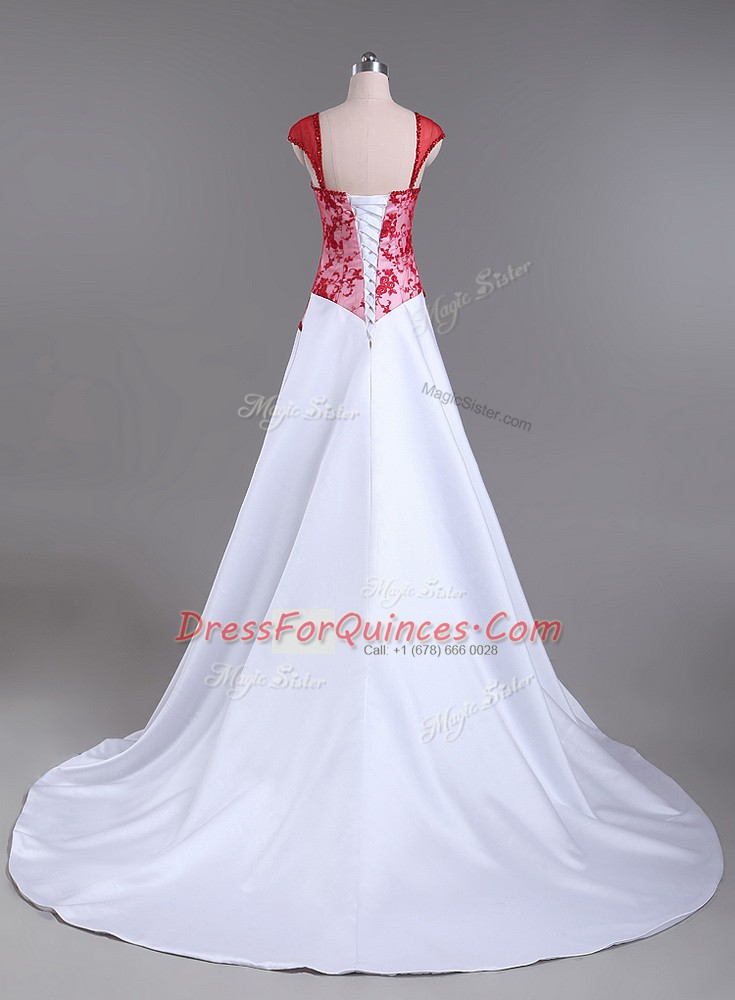 Modern White And Red Strapless Lace Up Lace and Appliques Party Dress Wholesale Court Train Cap Sleeves