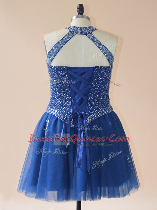 Royal Blue A-line Halter Top Sleeveless Tulle Mini Length Lace Up Beading Teens Party Dress