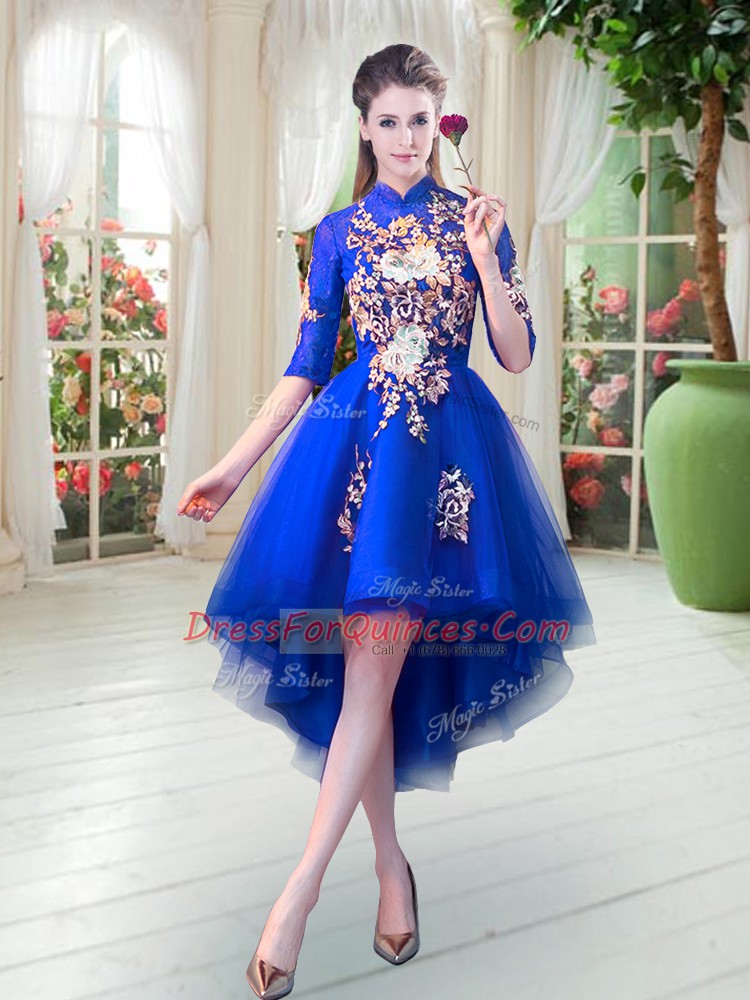 Suitable Royal Blue Half Sleeves Appliques High Low Womens Party Dresses