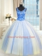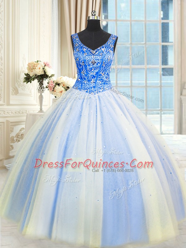 Adorable Sleeveless Floor Length Beading and Sequins Lace Up Vestidos de Quinceanera with Blue And White