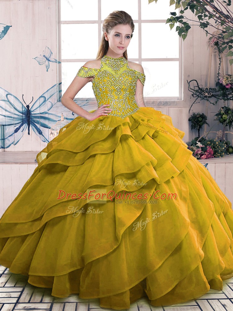 Affordable Brown High-neck Lace Up Beading and Ruffled Layers Sweet 16 Dresses Sleeveless
