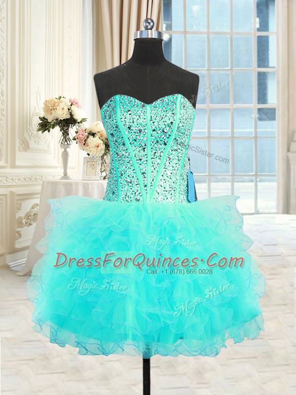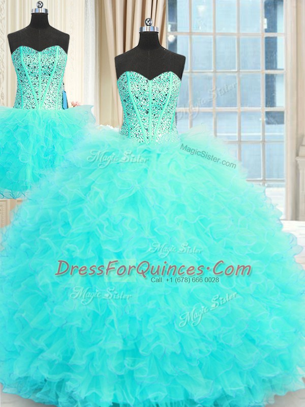 Amazing Three Piece Tulle Strapless Sleeveless Lace Up Beading and Ruffles Vestidos de Quinceanera in Aqua Blue