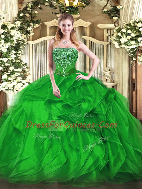 Attractive Green Organza Lace Up Strapless Sleeveless Floor Length Quince Ball Gowns Beading and Ruffles