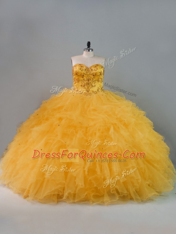 Beautiful Gold Lace Up Quinceanera Dress Beading and Ruffles Sleeveless Floor Length