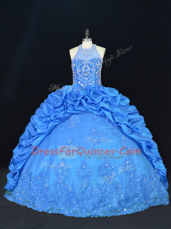 Captivating Floor Length Blue Vestidos de Quinceanera Halter Top Sleeveless Lace Up