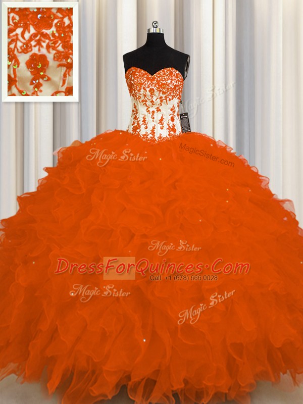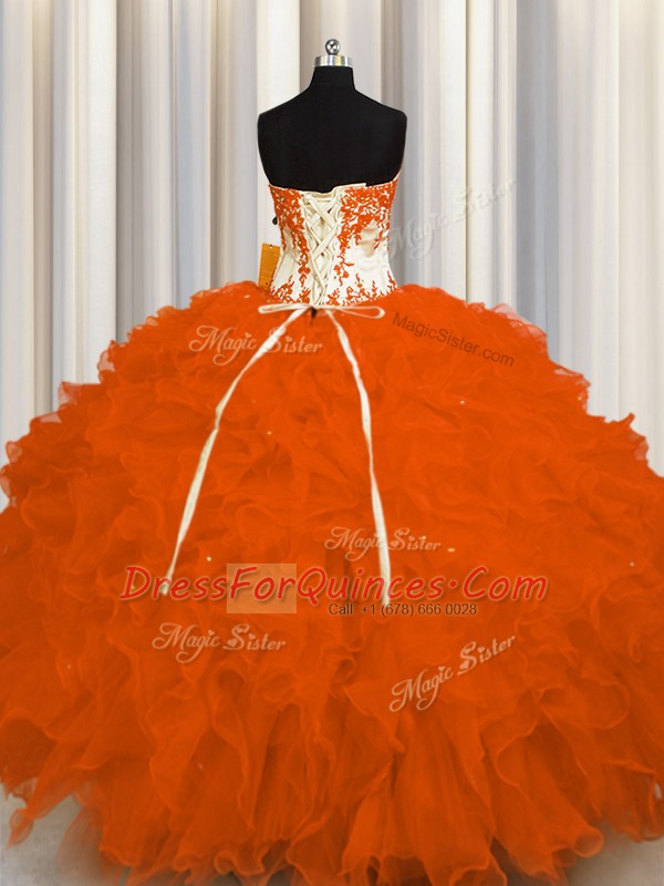 Custom Made Orange Red Quince Ball Gowns Military Ball and Sweet 16 and Quinceanera and For with Appliques and Ruffles Sweetheart Sleeveless Lace Up