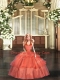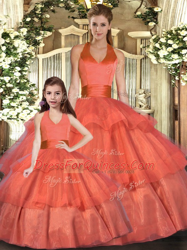 Customized Floor Length Orange Red Quinceanera Dress Organza Sleeveless Ruffled Layers