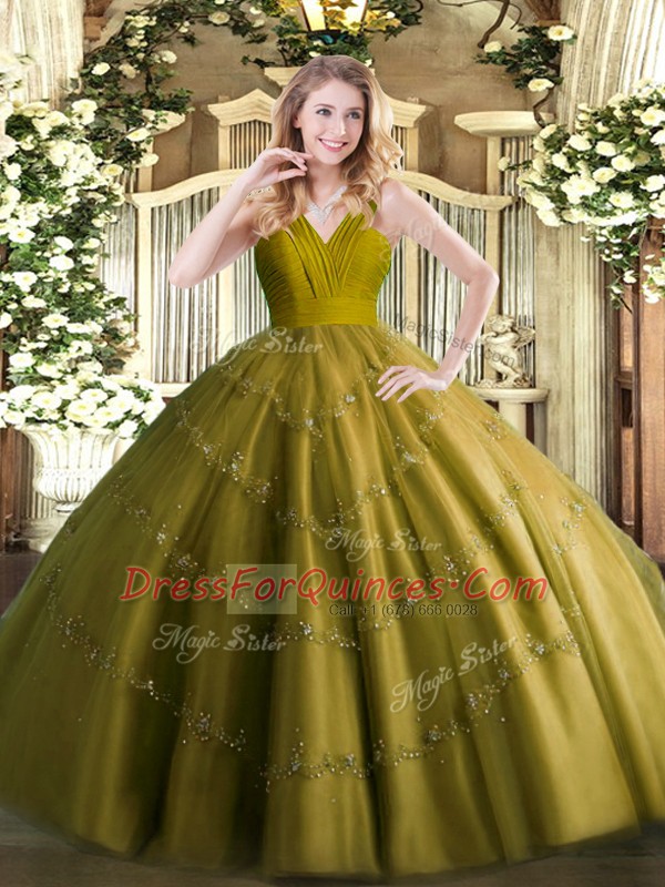 Deluxe Tulle V-neck Sleeveless Zipper Beading Vestidos de Quinceanera in Olive Green