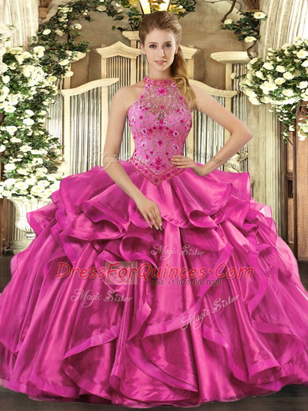 Designer Fuchsia Quinceanera Gowns Sweet 16 and Quinceanera with Beading and Embroidery and Ruffles Halter Top Sleeveless Lace Up