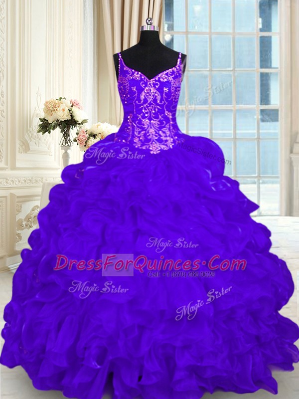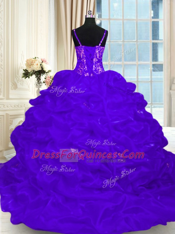 Elegant Purple Lace Up Sweet 16 Dress Beading and Embroidery and Ruffles and Pick Ups Sleeveless Brush Train