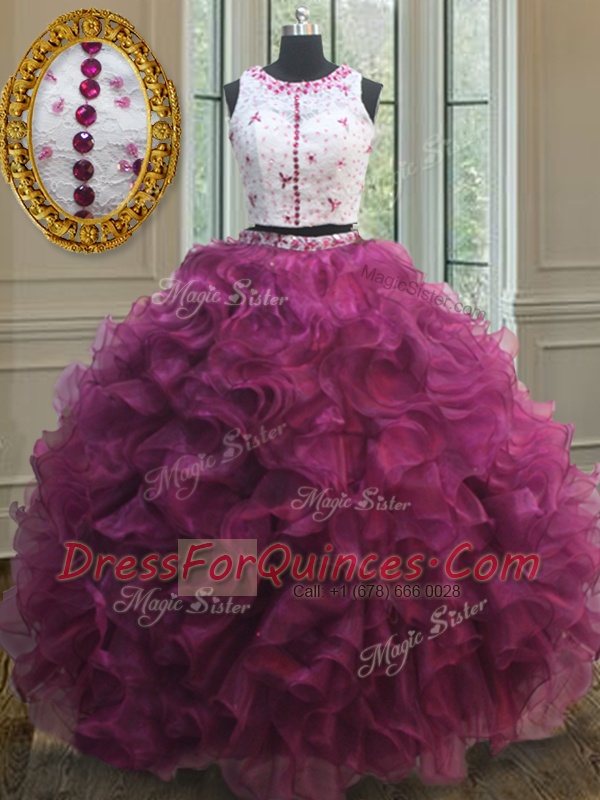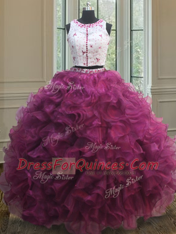 Elegant Scoop Floor Length Two Pieces Sleeveless Burgundy Quinceanera Gown Zipper