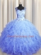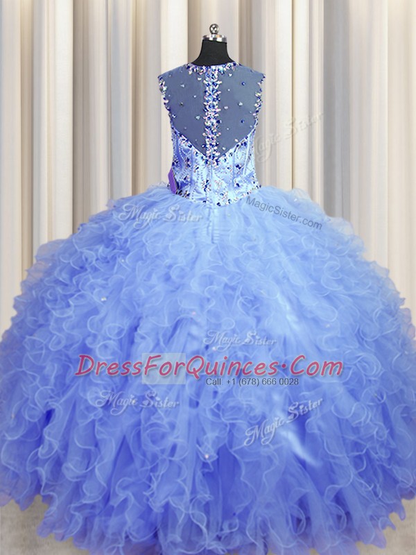 Extravagant See Through Zipper Up Sleeveless Tulle Floor Length Zipper Quinceanera Dresses in Light Blue with Beading and Ruffles