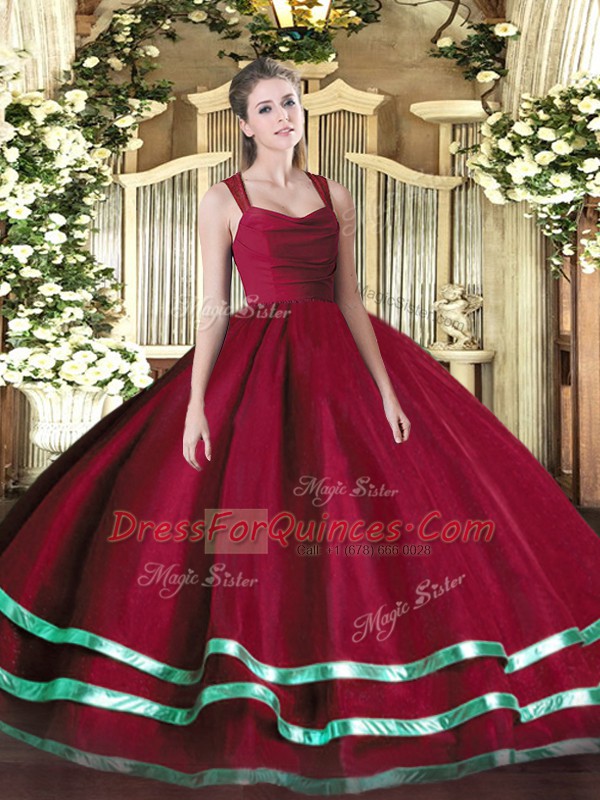 Fashion Wine Red Organza Zipper Straps Sleeveless Floor Length Sweet 16 Dresses Ruffled Layers and Ruching